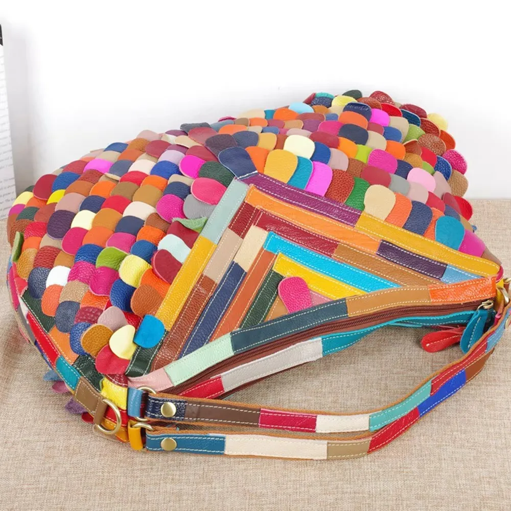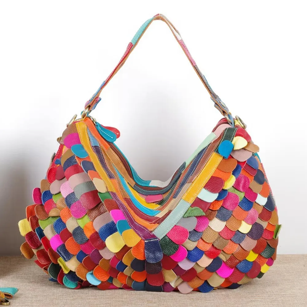 The patchwork pattern gives the bag a unique, stylish look that stands out from the crowd.